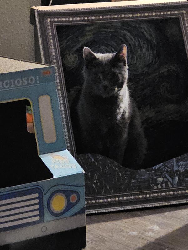 My kitty’s new favorite napping spot! She always liked laying on top of cardboard scratchers and absolutely loves boxes. My favorite thing about this is that when she lays inside, it looks like she’s part of the painting!