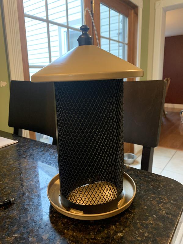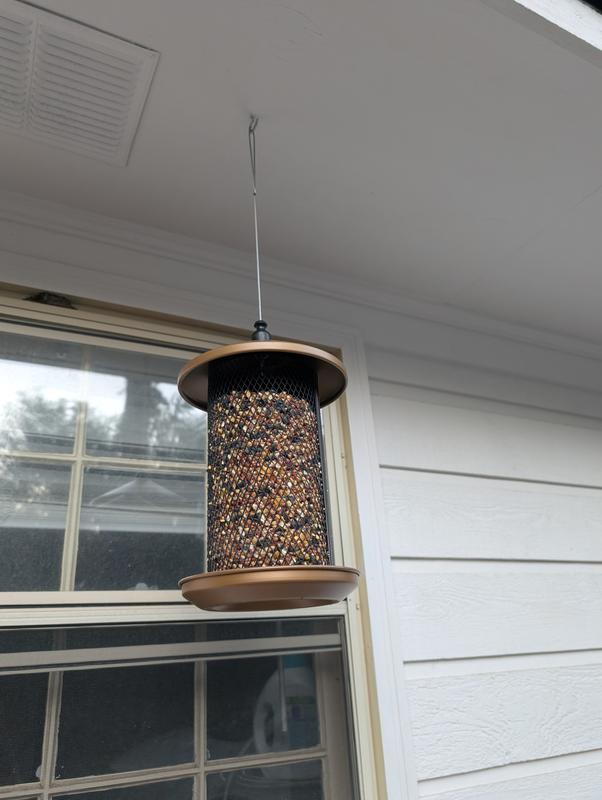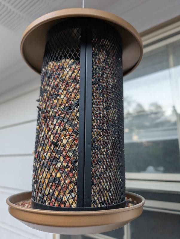 This bird feeder is really nice, well-constructed, and I like the color. It's a brass/gold color and matches perfectly with my house. It's pretty large in size, but doesn't feel too heavy and hangs easily. It also has two different sized sides for seeds. One side has smaller grate holes for smaller seeds, and the other side has bigger holes (see photos). Very versatile! I hung it outside my window so my cats can watch the birds come by! Side note: I also think the wire top hanger will make it a bit harder for squirrels to gain access to the seeds.
