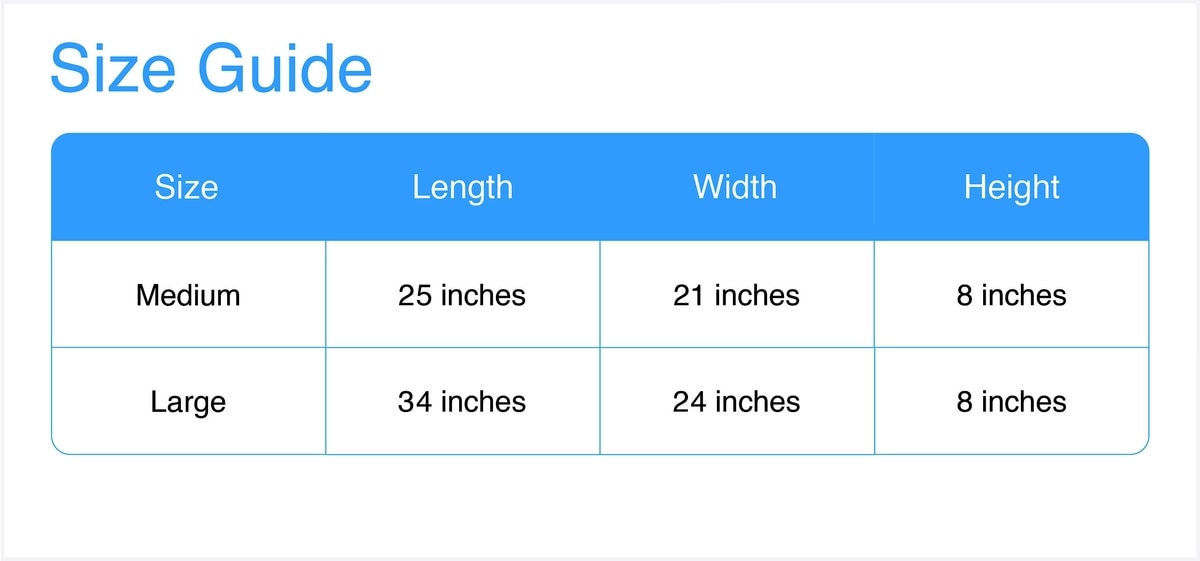 We recommend measuring your pet in their natural sleeping position to find the perfect bed size. Pets who curl up to sleep can fit on a smaller bed, while pets who stretch out need a larger bed. To determine the ideal bed length, measure your pet in their normal sleeping position, then add 4-6 inches for cats and small dogs, or 8-12 inches for medium to large dogs. When in doubt, we suggest ordering the bigger size. The Medium bed measures 25 inches long x 21 inches wide x 8 inches tall and the Large bed measures 34 inches long x 24 inches wide x 8 inches tall.