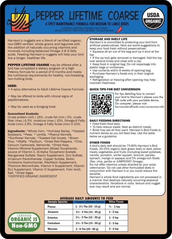 Feeding Directions: - Once converted to Harrison's Bird Foods birds should be fed in a planned daily regimen of individual meals. - Feed fresh food daily, do not "top off". Daily Feeding Amounts: PIONUS: 10 - 15g AMAZON: 15 - 30g ECLECTUS: 15 - 30g COCKATOO: 15 - 50g MACAW: 20 - 60g