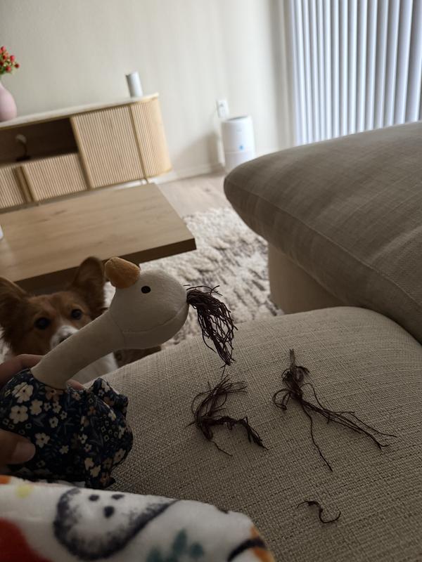 My Daisy (corgi pup) loves to chew and dissect her toys if they aren't sturdy enough. In days of getting this toy, I found pieces of the yarn hair around my place