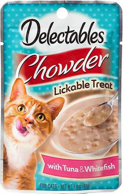 I have a picky cat. You can't tell by looking at him, all 18 lbs. But he will let me know when he doesn't care for something. Tried the chowder recipe, and he gobbled it down. As he usually does with most of the Delectable stews and broths. I figured it was a bit of a risk since he doesn't seem to like the bisque varieties. And they seem similar. He's eating them so who knows, he is a spoiled boy.