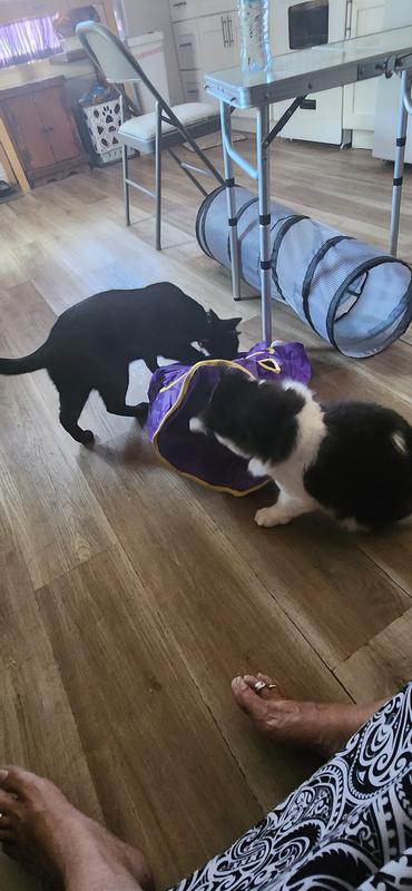 Both of my cats loved this crinkle bag until the younger (7-year-old), smaller one got stuck in it. He had gone into the opening of the bag and popped his head through one of holes on the top. He tried to exit the bag through that top hole, getting his head and one arm stuck. We tried to ease him back through but the hole was too tight and we ended up having to cut the bag to get him out. Immediately tossed it in the trash. We’re grateful we were home when it happened. Recommend extreme caution when allowing kitties to play with this toy.