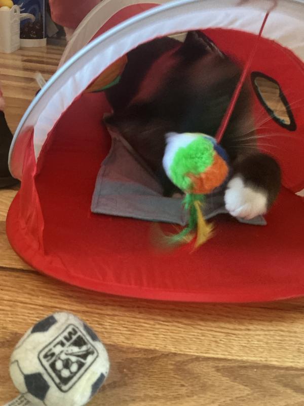 This tent features a detachable crinkly mat for scratching.