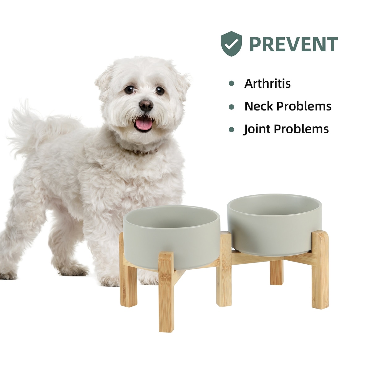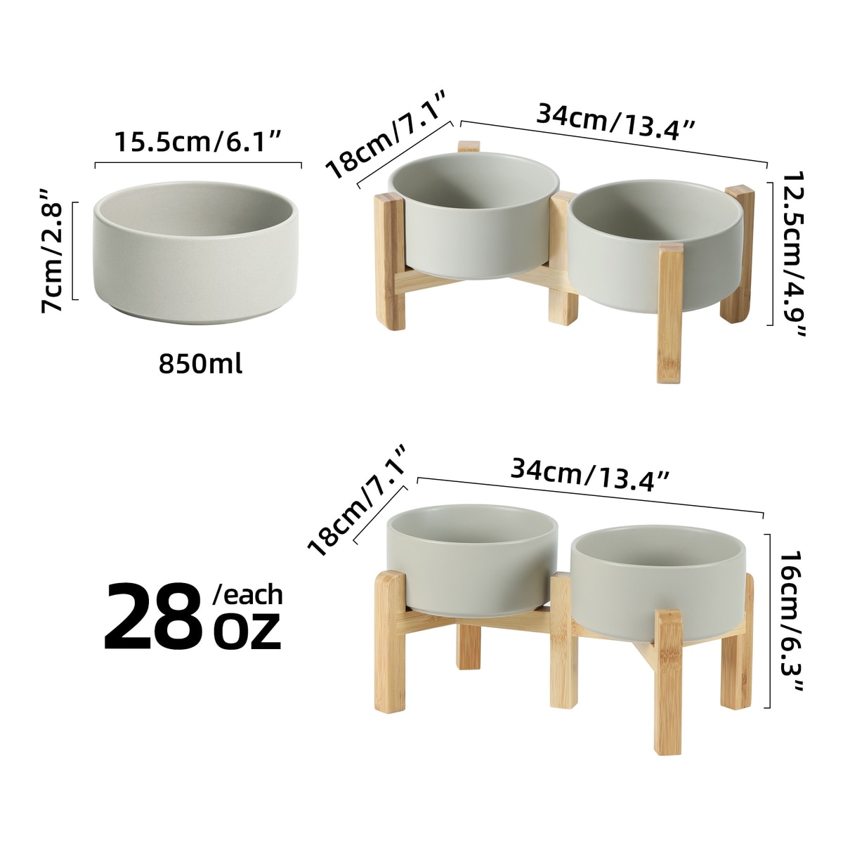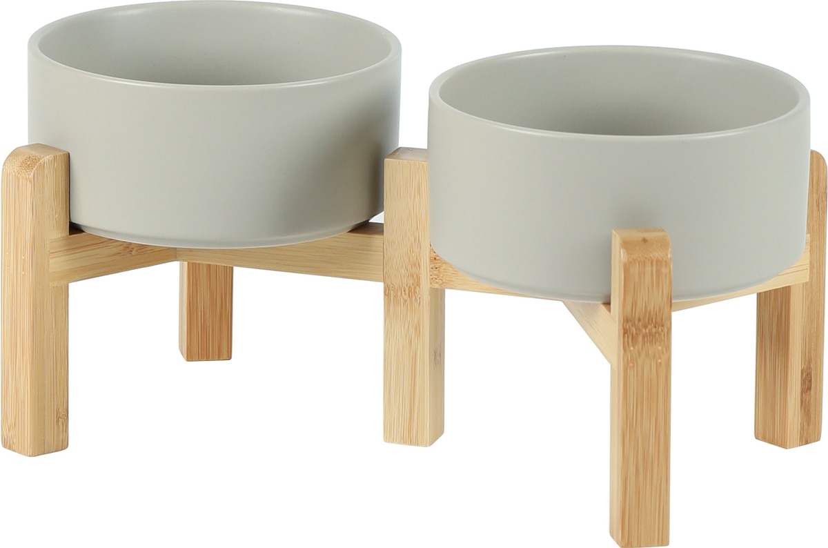 Havniva Ceramic Raised Dog Double Bowl Set with Stand, Grey, 6-in