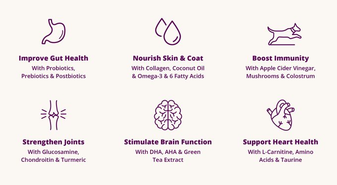 Coconut Oil, Apple Cider Vinegar, Turmeric, Pepper, Ginger, Colostrum, Blueberry, Cranberry, Goji Berry, Tart Cherry, Pomegranate, Pineapple, Papaya, Apple, Kelp, Seaweed Meal, New Zealand Green Mussel, Carrot, Green Tea, Sage, Parsley, Spinach, Kale, Basil, Thyme, Ashwagandha, Chaga, Lion’s Mane, Reishi, Turkey Tail, Shiitake, Maitake, Cordyceps.