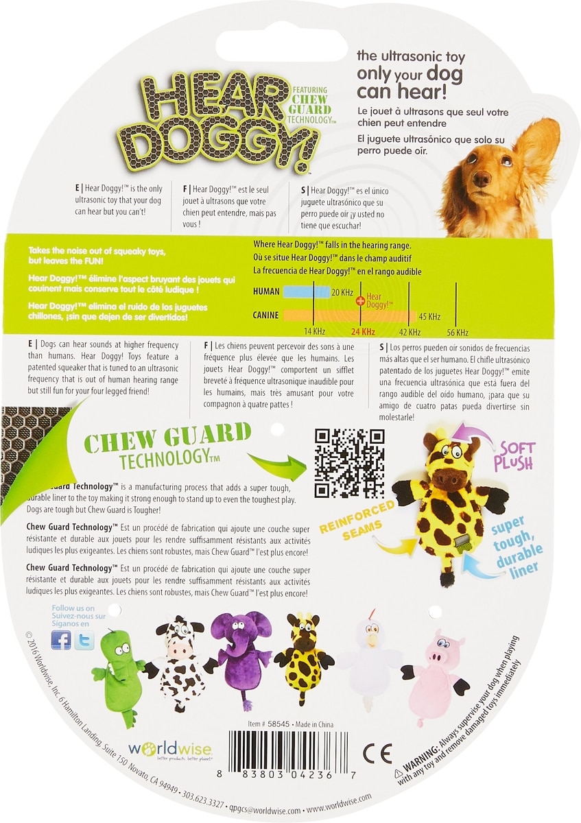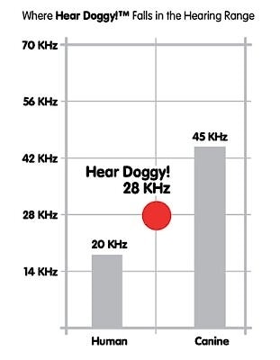 - Dogs can hear sounds at a higher frequency (0 to 45KHz) than humans (0 to 20 KHz) so Hear Doggy! toys are made with a squeaker tuned to an ultrasonic range in the 24-28 KHz frequency, that only dogs can hear, so no more enduring the high-pitched repetition of annoying squeakers