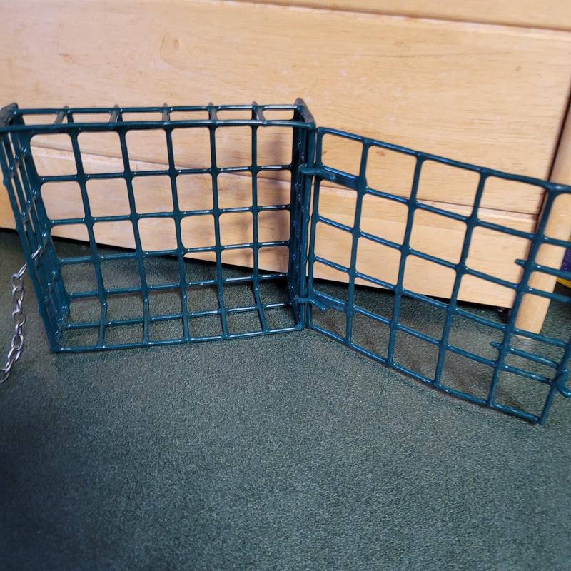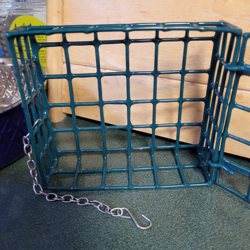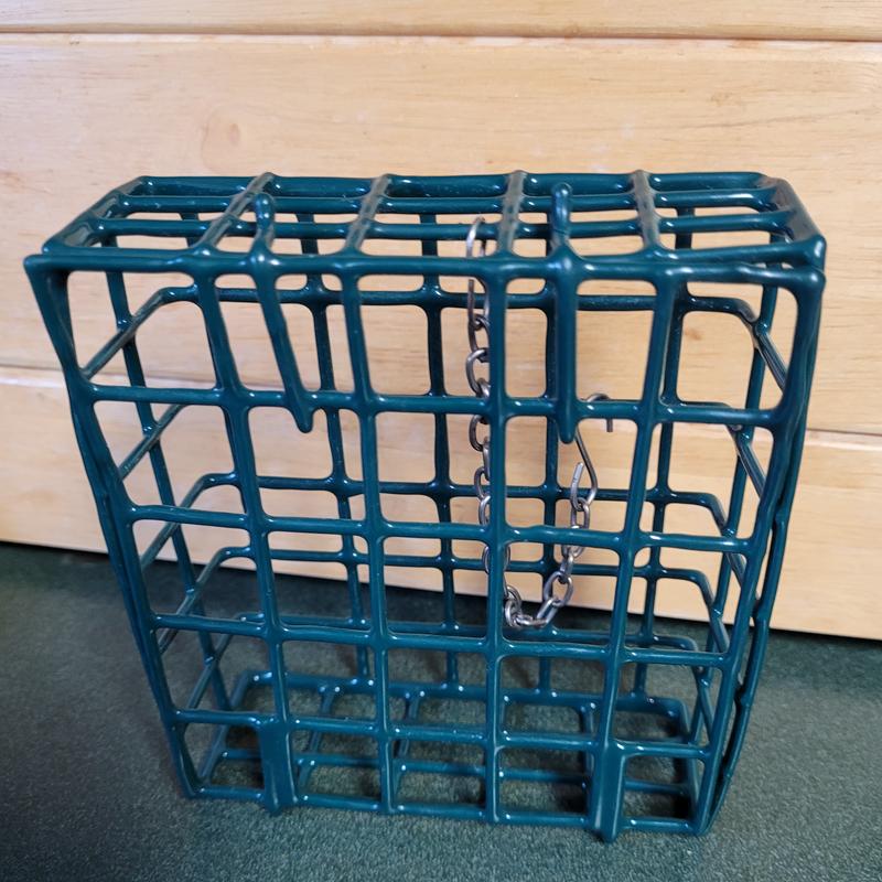 Good cage for birdie cakes. Solid, covered wire, safe and easy to use. Opens and shuts securely. Nice size cage holds even larger suets. Easy to hang almost anywhere.
