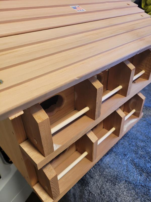 This bird house is amazing quality. The type of wood is water repellent so you don’t have to do anything to it to keep it from rotting, it’s big enough with 12 spots