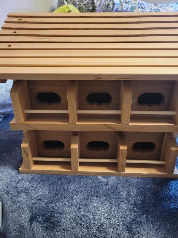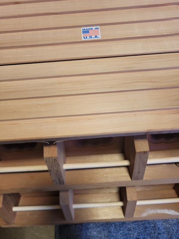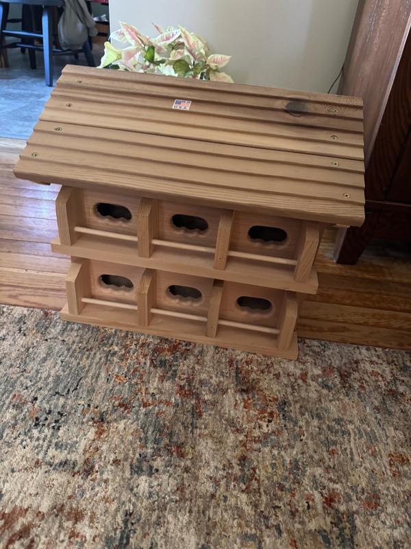 This bird house is amazing quality. The type of wood is water repellent so you don’t have to do anything to it to keep it from rotting, it’s big enough with 12 spots for birds to make houses. It’s really good quality!