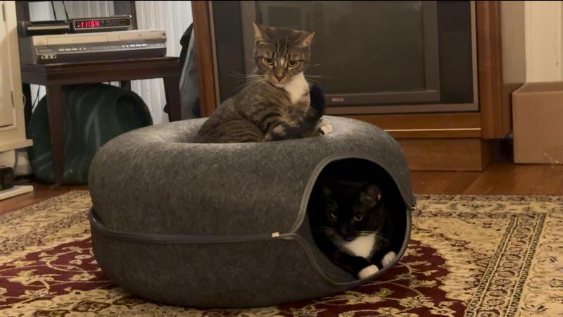 I wanted a second cubby (they have a felt cave) and they love this. As soon as I opened it they were playing. It’s fun when one is inside you can tap the outside and they chase the sound. When they are playing together they love to hide in here and the other will wait around and they run around. One cat also just loves to sit on top. Was originally worried they might not like it (classic cats)but have had it for almost a month and it was worth it for my two playful boys!