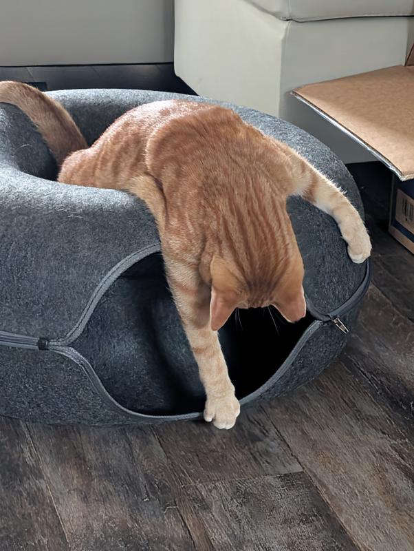 • The unique combination of a donut bed up top and a tunnel bed below offers interactive play and comfortable sleep for your furbaby.
