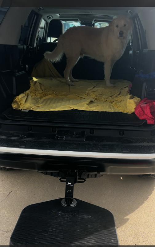 This thing is amazing. I have a Jeep and my dogs go everywhere with me. One of them won’t jump and I don’t like for them to jump down either and put all that force on their joints. We installed this and it’s awesome! Just took a few minutes and it is heavy duty, it doesn’t wiggle or rattle. My dogs love it. I have had so many people ask me about when they see me using it. Another great feature is that is spins around and stores under my Jeep so nothing is sticking out. A level lets you spin it back out for easy use. No more lifting a 40lb dog into the back and lifting them back out. They jump right in. I LOVE THIS THING!!