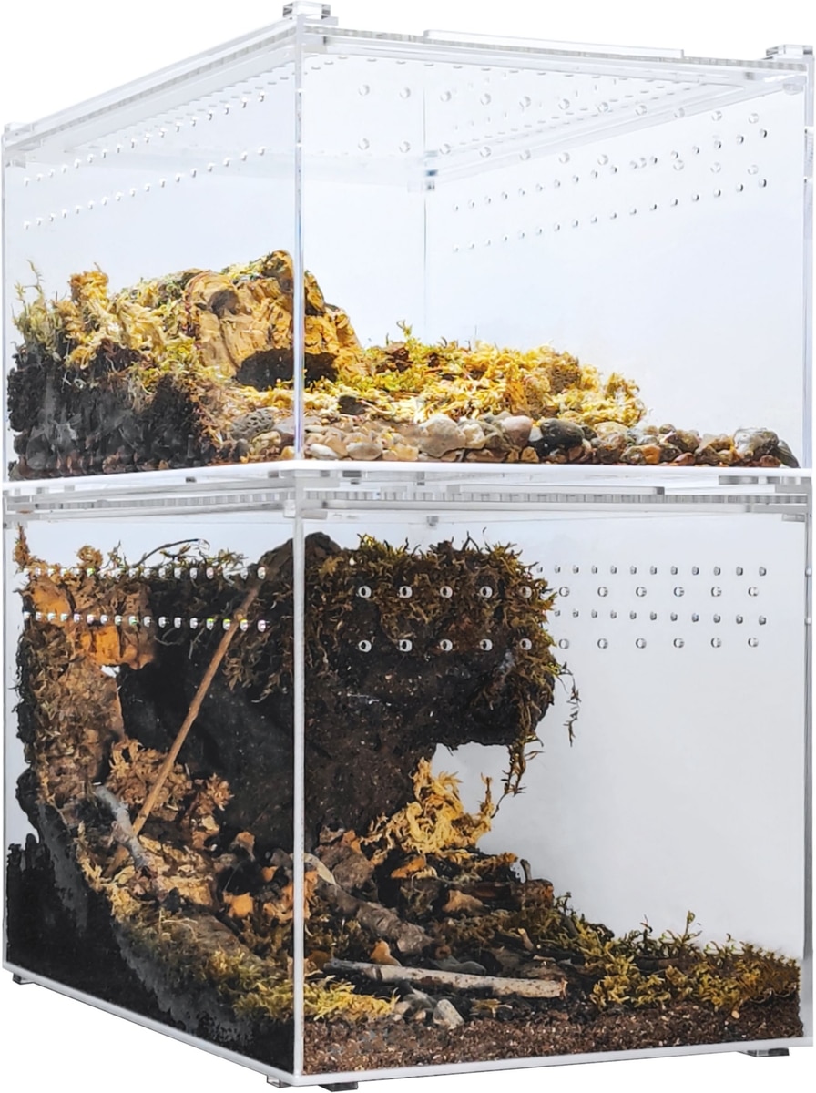 These are marginally cheaper the TC enclosures but savings is savings, right? And these are decent for the price. Clear, don’t scratch as easily as some other “bargain” enclosures, and they’re pretty sturdy. The only thing I don’t much care for is the side the top opens on. I have to take these enclosures down off the shelf just to top up the water dish, which is sort of a pain. I’d really prefer that they opened towards the front. That way, the enclosure next to it wouldn’t impede opening it. Er. Okay, one more thing; the side that doesn’t have any vent holes is weird. I’d rather it was one of the long sides. I can’t tell if they intended this enclosure to be used so that the short sides where the door pulls out is supposed to be the front or not. If that’s the case, why is the side without the holes on the opposite end? The logo is on the end with the holes. Idk. The layout is confusing. I’ve been using mine sideways. Better viewing that way. Maybe a “sideways” model would be a nice addition to their product line?