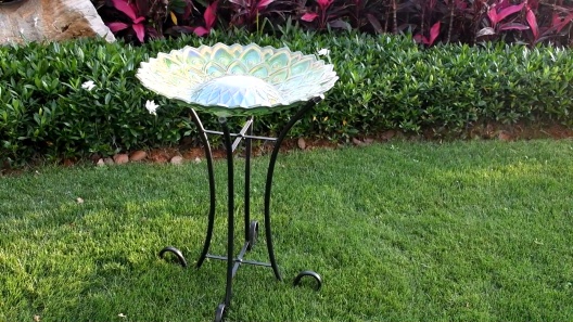 Hi-Line Gift Solar Green Fusion Mosaic Floral Glass Bird Bath with Stand, Multicolor