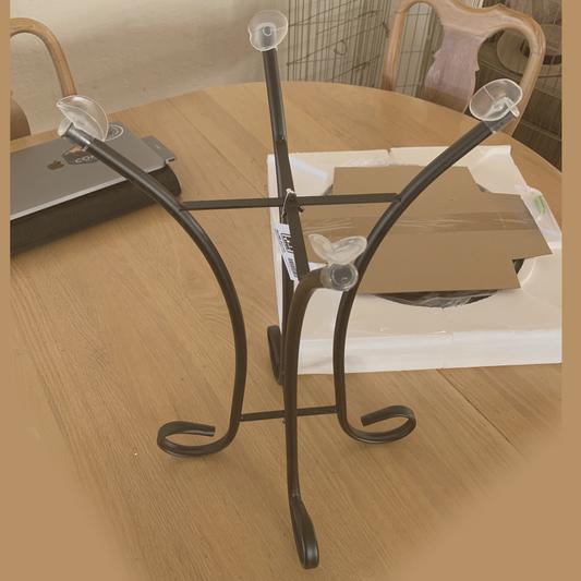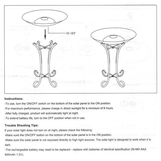 Just arrived. Packed well. Base has 2 wingnuts to tighten when assemble and soft plastic suction cups hold basin. Extra battery included. 21" high (shorter than standard birdbaths). Very attractive. Solar light is a plus since this birdbath looks beautiful with or without the light.