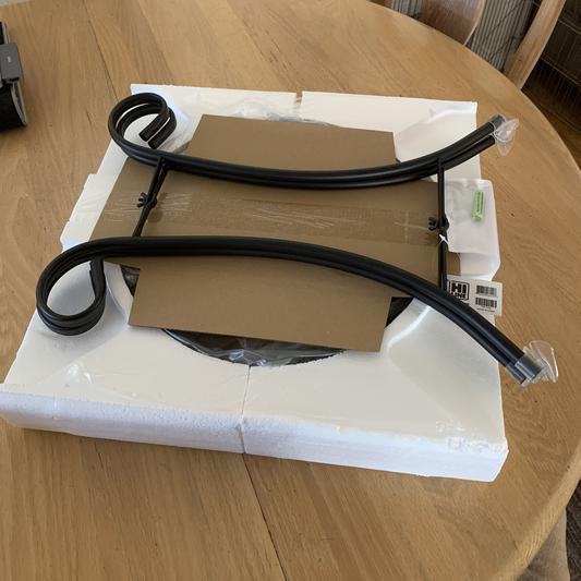 Just arrived. Packed well. Base has 2 wingnuts to tighten when assemble and soft plastic suction cups hold basin. Extra battery included. 21" high (shorter than