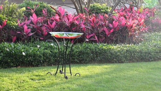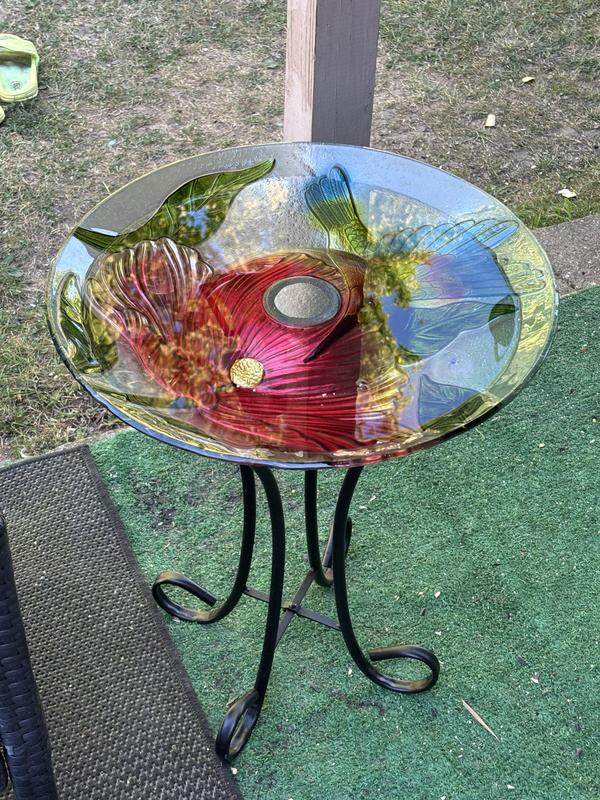 I have been debating on getting this bird bath for some time. The colors are bright and cheerful. Needless too say I was disappointed when the item was broken when it shipped to my house. The bird bath glass came in tacked. The solar power night light was broken. When I went to check on the batteries, the battery that came with the product was corroded, leaving residue all over my hands. I attempted to try another battery, except the wiring is fragile. When attempting to take the corroded battery out the wires were stuck to it.. Im glad that I did not purchase this at full price considering the product defects. Overall, it is a beautiful birdbath