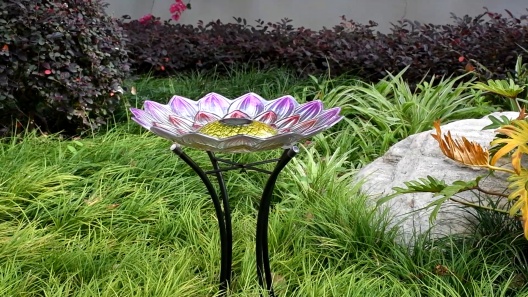 Hi-Line Gift Solar Pink Floral Glass Bird Bath with Stand, Multicolor