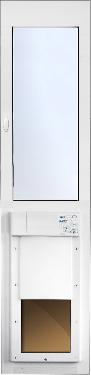 Turn any sliding glass door into a fully automatic pet door with these easy to install, full-height inserts that include an integrated Power Pet Door. Made of high-quality aluminum framing with a durable powder-coated finish, these weatherproof doors feature dual-pane tempered glass to insulate in even the harshest conditions. A spring-loaded top section makes for quick installation and a locking deadbolt helps ensure security.