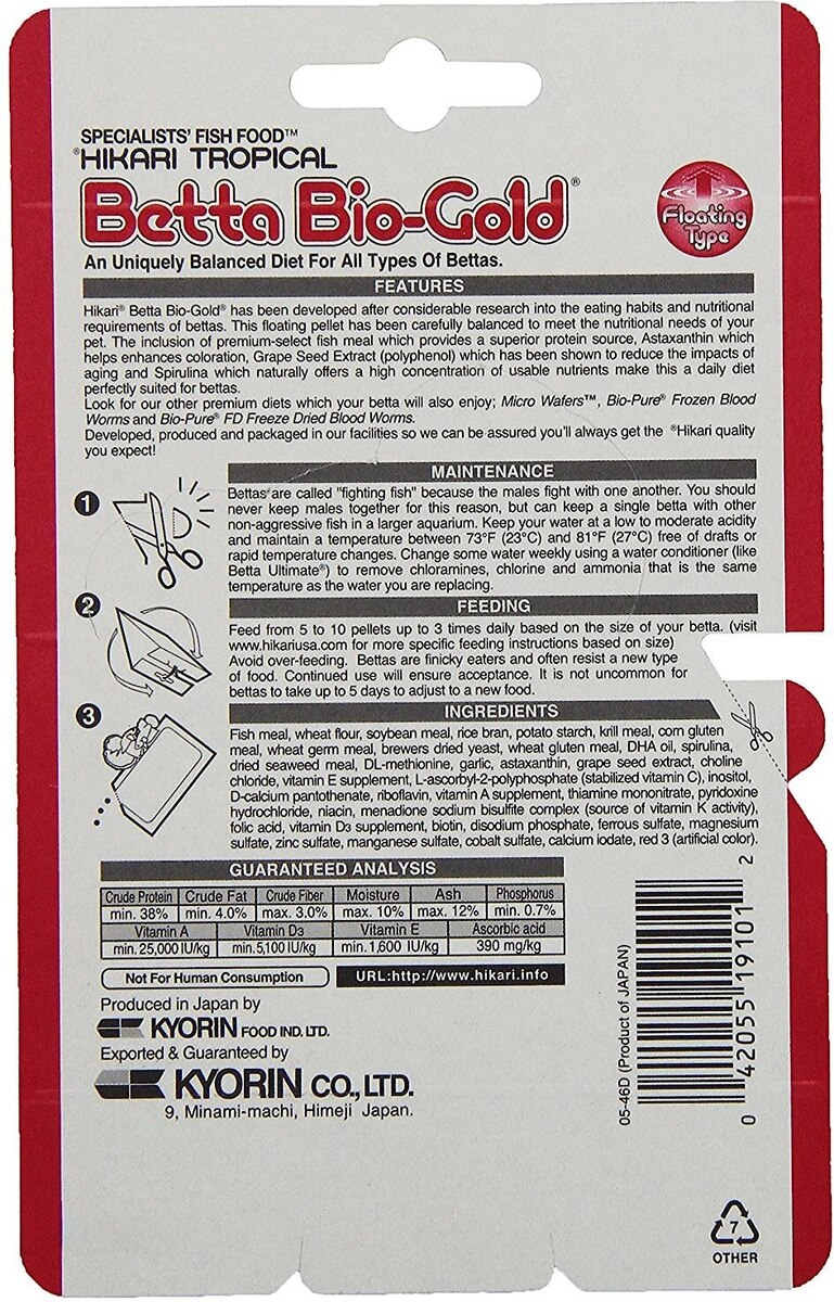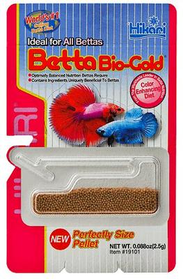 A friend came to visit and brought his betta, then FORGOT to take it home with him. The poor thing was just in a tall bottle with zero features for his comfort and no room to swim. I got him a 3.5 gallon tank kit and live plants and pellets that were just too large for him. He could rarely get one in his mouth. Then I discovered Hikari and presto-change-o the fish LOVES them and eats 5 or 6 of them within a few seconds. He is more energetic and colorful and happy now