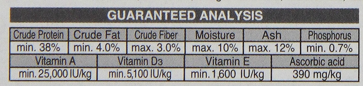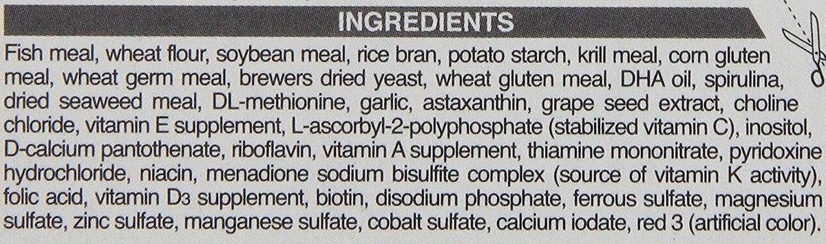 Fish Meal, Wheat Flour, Soybean Meal, Rice Bran, Potato Starch, Krill Meal, Corn Gluten Meal, Wheat Germ Meal, Brewers Dried Yeast, Wheat Gluten Meal, Fish Oil, DL-Methionine, Spirulina, Garlic, Dried Seaweed Meal, Astaxanthin, Choline Chloride, Vitamin E Supplement, L-Ascorbyl-2-Polyphosphate (Stabilized Vitamin C), Inositol, D-Calcium Pantothenate, Riboflavin, Vitamin A Supplement, Thiamine Mononitrate, Pyridoxine Hydrochloride, Niacin, Folic Acid, Vitamin D3 Supplement, Biotin, Vitamin B12 Supplement, P-Aminobenzoic Acid, Disodium Phosphate, Salt, Ferrous Sulfate, Magnesium Sulfate, Zinc Sulfate, Manganese Sulfate, Copper Sulfate, Calcium Iodate, Red 3 (Artificial Color).