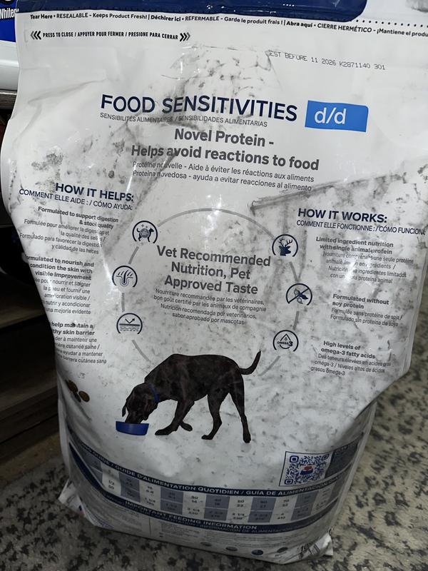 Dogs with skin and coat conditions or food sensitivities can benefit from Hill's Prescription Diet z/d and d/d foods. Prescription Diet d/d has limited ingredient nutrition and a single intact animal protein. The Prescription Diet z/d food features a highly hydrolyzed protein and a single carbohydrate source to minimize the risk of allergic reactions. Many pet parents discover that simply eating the right food helps eliminate food-related causes of skin irritation and helps avoid reactions to food.
