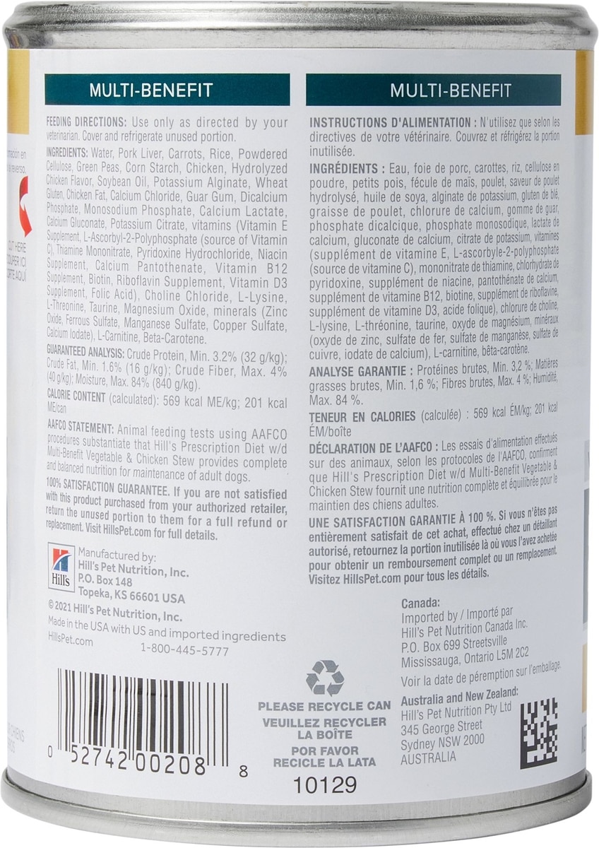Hill's Prescription Diet w/d Multi-Benefit Digestive, Weight, Glucose, Urinary Management Vegetable & Chicken Stew Wet Dog Food, 12.5-oz can, case of 12