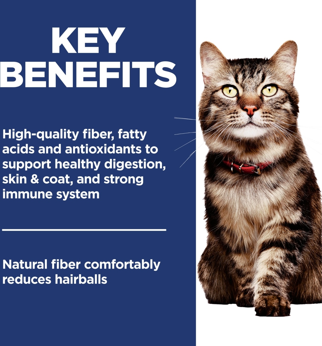 Hill’s Science Diet Adult Hairball Control Cat Food combines optimal nutrition with hairball prevention, to keep your hairball-prone cat nourished, happy and healthy. Formulated with high-quality protein, Vitamin E, and Omega-3 and -6 fatty acids for healthy skin and coat, this savory recipe has added fiber to help prevent hairballs and the digestive issues they can cause. All Hill’s recipes are made with wholesome natural ingredients and tested to ensure the highest standards of purity and nutrition.