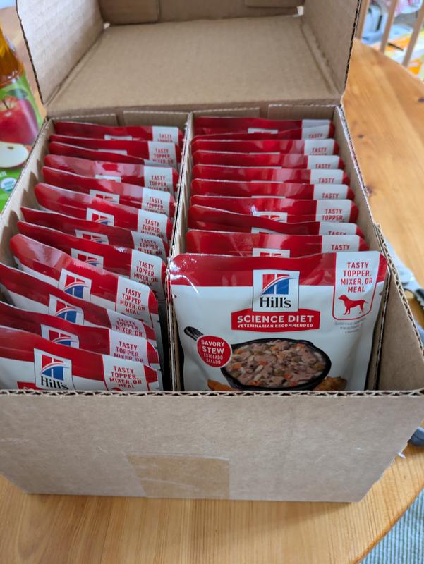The Science Diet healthy cuisine is a great addition to my dogs food. He usually takes forever to eat his food. Now I add a tiny amount of his hard food and this as a topper and he eats quickly. He is a tiny guy so one packet per meal is great. I love that it is real food instead of just hard dog food.