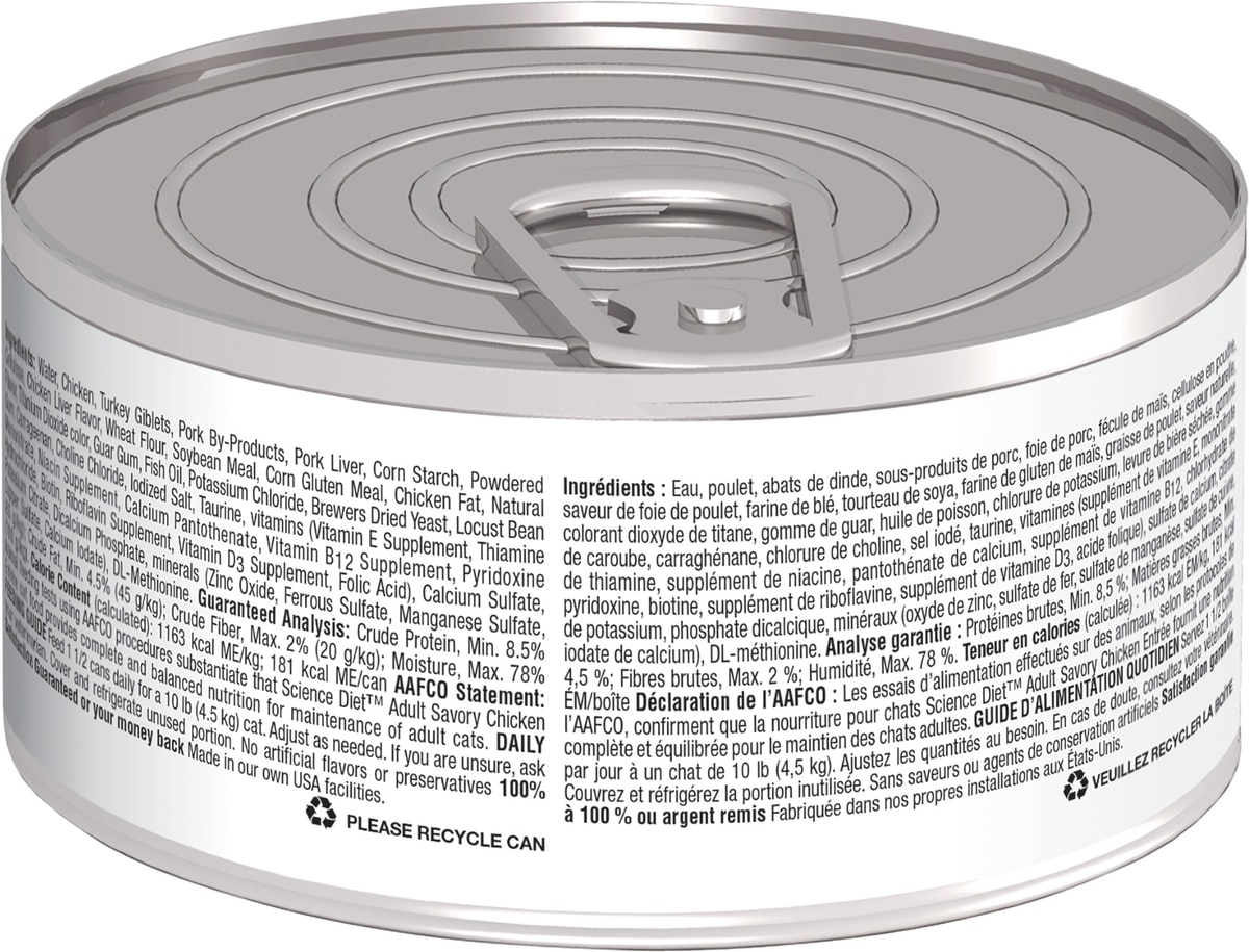 - Hill's Science Diet Adult Tender Chicken Dinner Wet Cat Food, 5.5-oz can, case of 24$59.76 Chewy Price$62.64 List Price$56.77 Autoship PricePromo, Save 40% on your first Autoship +1 deal