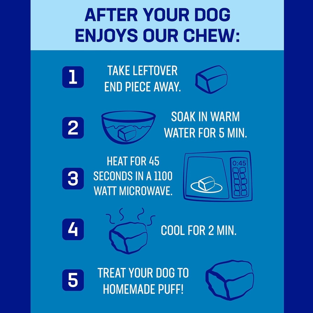 To create a Yaky Puff for your dog, soak the leftover piece of cheese chew in warm water for 5 minutes, then microwave the piece for 45 seconds. Allow the chew to cool for 2 minutes before offering the treat to your dog.