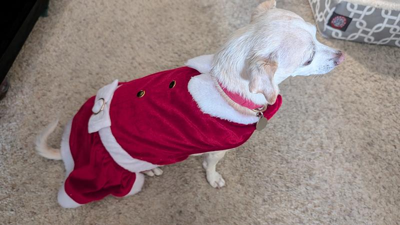 Mrs. Claus’ dress is vibrant and so cute. I purchased it for my grand dog Havana who’s a white Siberian Husky. She will look fabulous for the holidays. Thank you Chewy.
