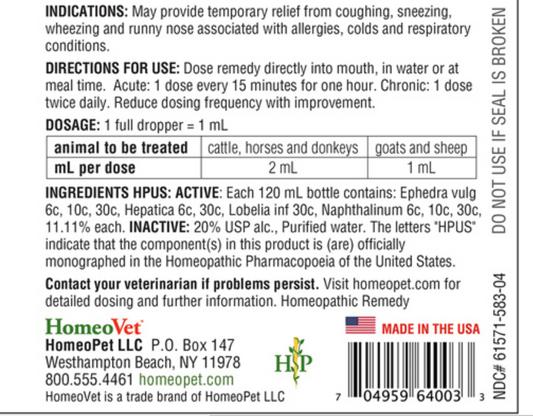 HomeoVet EquioPathics Cough & Allergy Liquid Farm Animal & Horse Supplement, 120-mL bottle