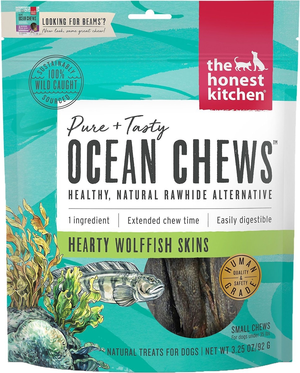 - The Honest Kitchen Human Grade Beams Ocean Chews Cod Fish Skins Dehydrated Dog Treats, Small, 2.75-oz bag$11.00 Chewy Price$13.99 List Price$10.45 Autoship PricePromo, New Customers Only: Spend $49+, Get $20 eGift Card