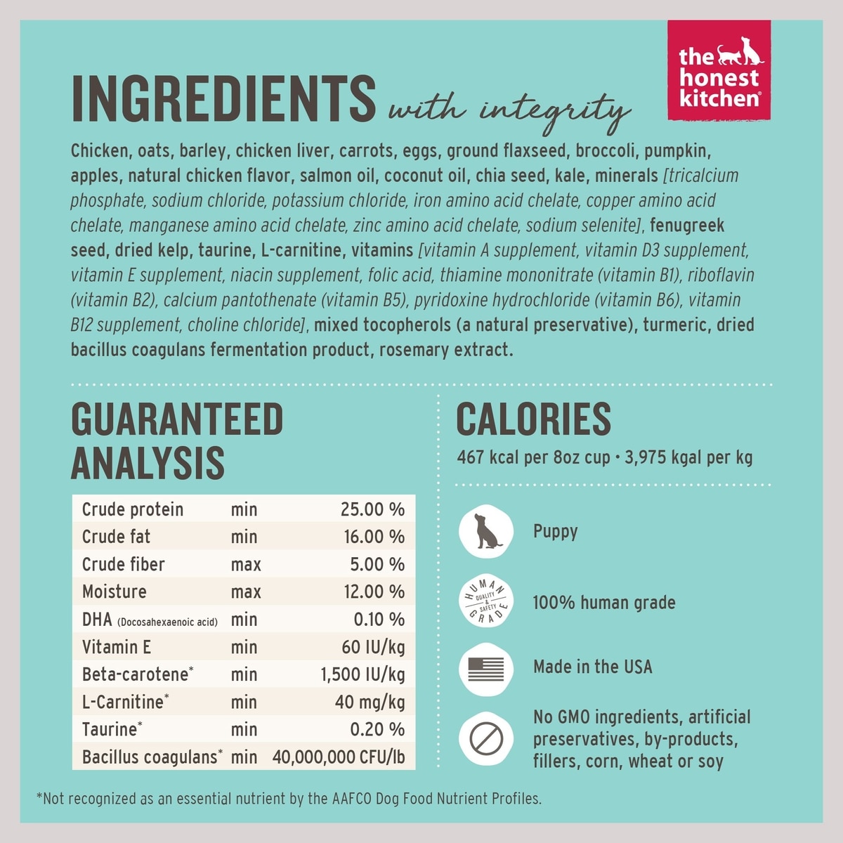 The Honest Kitchen Chicken Recipe is formulated to meet the nutritional levels established by the AAFCO Dog Food Nutrient Profiles for all life stages including the growth of large size dogs (70 pounds or more as an adult).