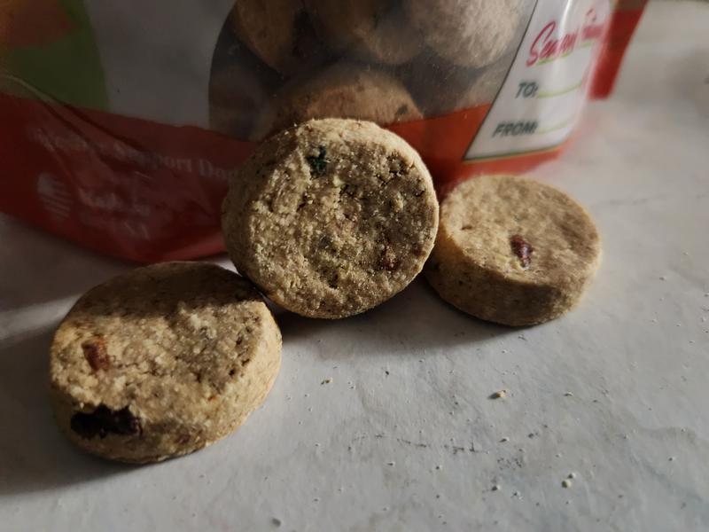 Palatable, good ingredients, perfect texture! Sometimes I shy away from really crunchy treats because I can’t break them up for training but these held together pretty well! They’re the perfect size for my 50lb doodle…. And he LOVED them. He was definitely trying to steal the package from the counter before I even opened it. He can be a little picky so I was happy about that! The ingredients list is short, which is always appreciated, and I love seeing ingredients like pumpkin, cranberries, pomegranate, carrots, and cinnamon! Those are things I would put in homemade treats, so picking this off a shelf is awesome. Another thing about that — the size of the bag is perfect for a gift basket (of course for the holidays) or just to have some variety! Bulk bags are great, but I like to spoil my pup with new treats too often so the smaller bag is great!