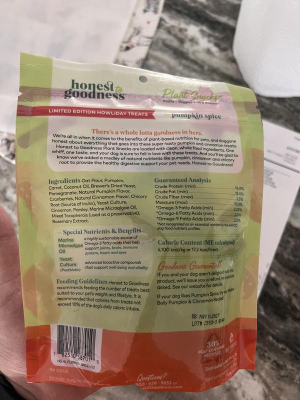 The Honest To Goodness Plant Snack Howliday Pumpkin Spice arrived, and my Boarder Collie was with me. As I opened the box my dog was waiting for me to open the package and give him the treat. He really loved these treats and wanted more every time I get the bag out.
