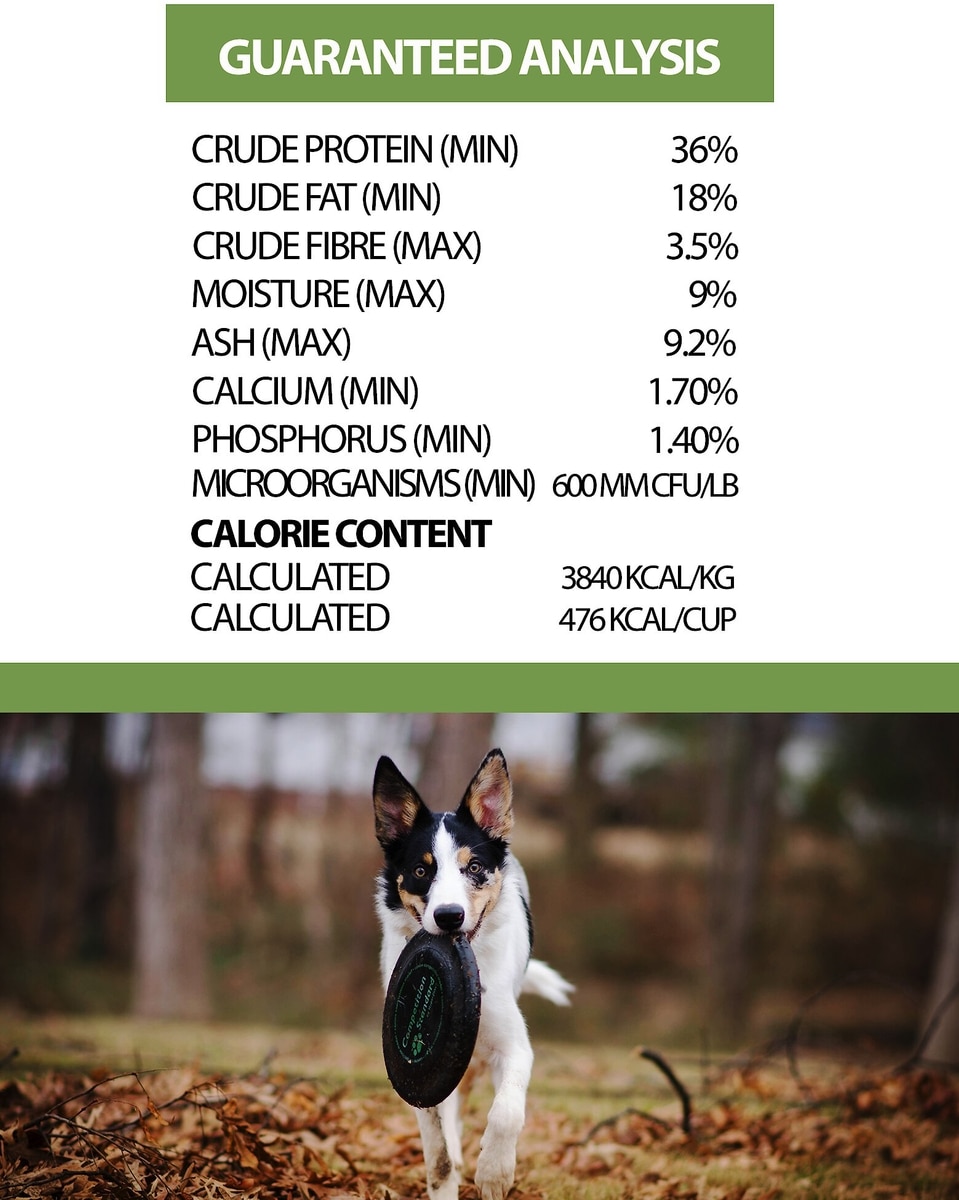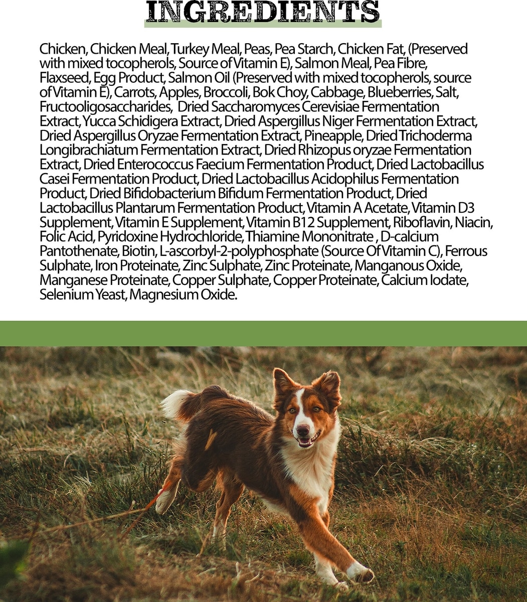 Chicken, Chicken Meal, Turkey Meal, Peas, Pea Starch, Chicken Fat (Preserved With Mixed Tocopherols, Source Of Vitamin E), Salmon Meal, Pea Fiber, Flaxseed, Egg Product,Salmon Oil (Preserved With Mixed Tocopherols, Source Of Vitamin E), Carrots, Apples, Broccoli, Bok Choy, Cabbage, Blueberries, Salt, Fructooligosaccharides, Dried Saccharomyces Cerevisiae Fermentation Extract, Yucca Schidigera Extract, Dried Aspergillus Niger Fermentation Extract, Dried Aspergillus Oryzae Fermentation Extract, Pineapple, Dried Trichoderma Longibrachiatum Fermentation Extract, Dried Rhizopus Oryzae Fermentation Extract, Dried Enterococcus Faecium Fermentation Product, Dried Lactobacillus Casei Fermentation Product, Dried Lactobacillus Acidophilus Fermentation Product, Dried Bifidobacterium Bifidum Fermentation Product, Dried Lactobacillus Plantarum Fermentation Product, Vitamin A Acetate, Vitamin D3 Supplement, Vitamin E Supplement, Vitamin 812 Supplement, Riboflavin, Niacin, Folic Acid, Pyridoxine Hydrochloride, Thiamine Mononitrate, D-Calcium Pantothenate, Biotin, L-Ascorbyl-2-Polyphosphate (Source Of Vitamin C), Ferrous Sulphate, Iron Proteinate, Zinc Sulphate, Zinc Proteinate, Manganous Oxide, Manganese Proteinate, Copper Sulphate, Copper Proteinate, Calcium Iodate, Sodium Selenite, Magnesium Oxide.