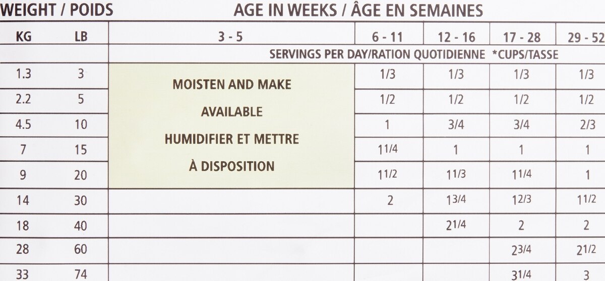 | Weight | 6 - 16 Weeks Old Daily Feeding (cup) | 17 - 28 Weeks Old Daily Feeding (cup) | 29 - 52 Weeks Old Daily Feeding (cup) |