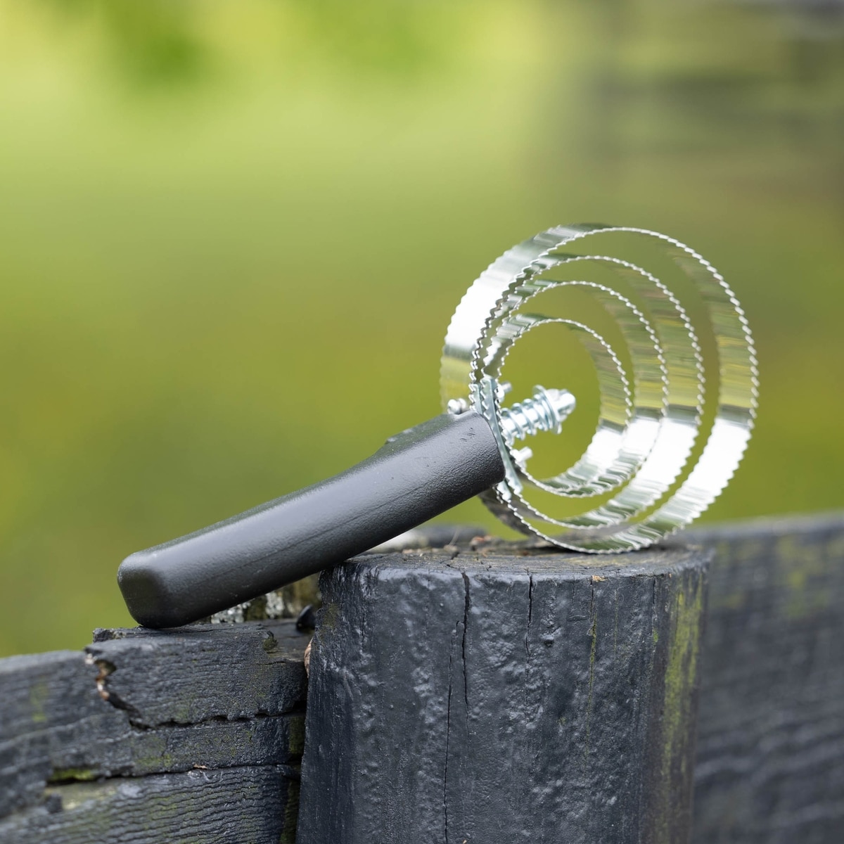 The comb features a comfortable, shaped plastic handle and stainless steel circular toothed blades.
