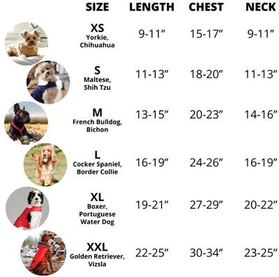 For the best fit, measure your dog’s length from the base of its neck to the base of its tail. This measurement serves as the primary measurement in this brand's clothing. That, along with the breed guide provided here and your dog’s neck and chest measurements, will determine the best fit. For broad-chested and long-bodied dogs, consider going up a size.