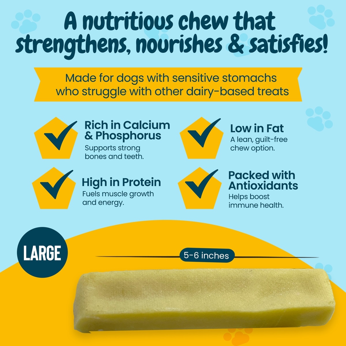 My dog is an Olympic chewer. It would take her only a few minutes up to 30 mins to chew on other treats and “poof” it was gone. This yak cheese keeps her busy for