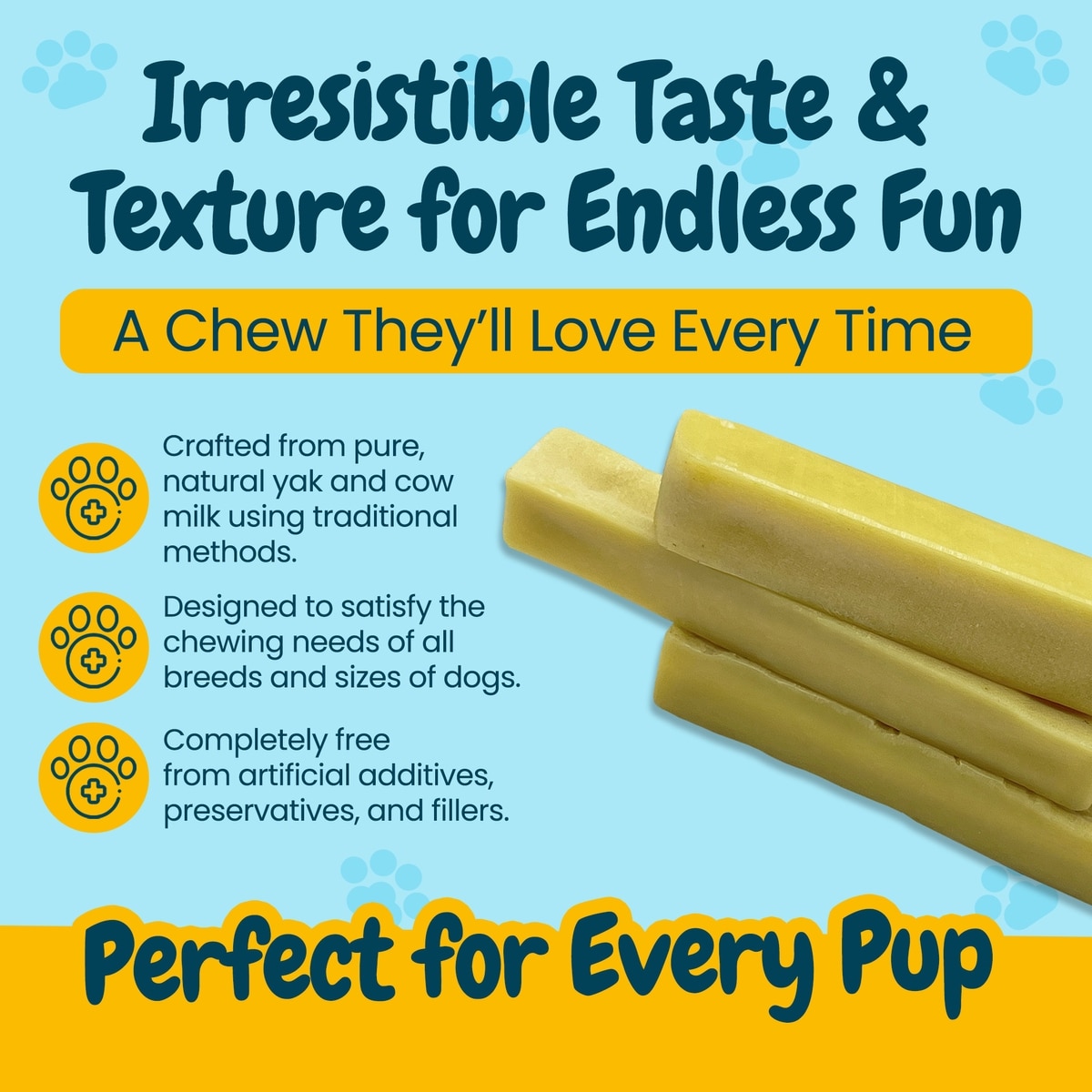 My dog is an Olympic chewer. It would take her only a few minutes up to 30 mins to chew on other treats and “poof” it was gone. This yak cheese keeps her busy for hours. She loves ves them.