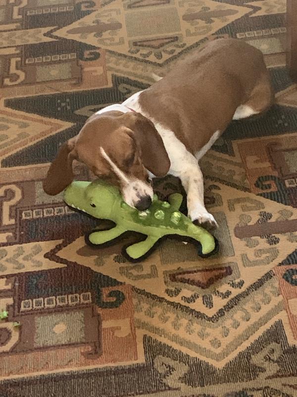 Within 10 minutes, my beagle had chewed the plastic pieces on the top and pulled out the stuffing.... more