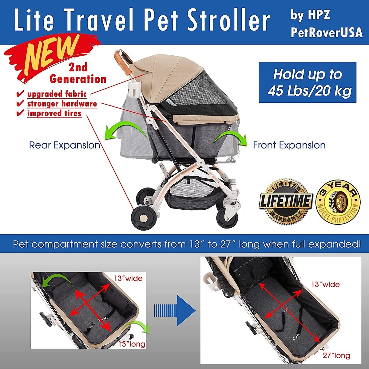 HPZ Pet Rover Lite Premium Light Travel Airline-Compatible Pet Stroller, Taupe