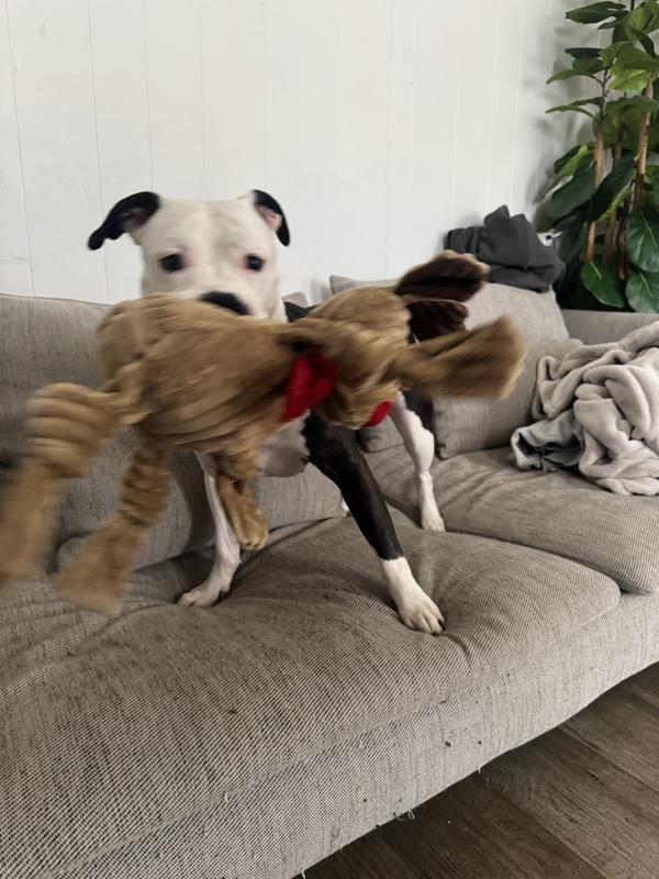 My pittie loves this toy! She usually destroys any toy within 5 minutes. This girl’s been at it for three hours and not even a scratch. She loves the squeaker t
