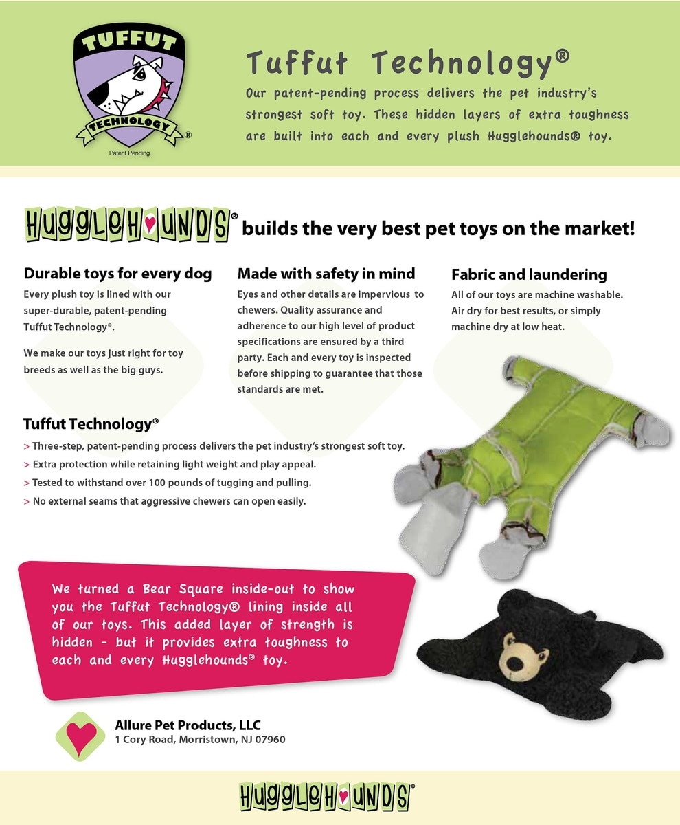 Each Knottie is protected by HuggleHounds exclusive Tuffut Technology, a three-layer, firefly-green colored lining that helps even their softest toys last and last. It’s just one of the ways HuggleHounds makes sure their toys can stand up to even the toughest play sessions.