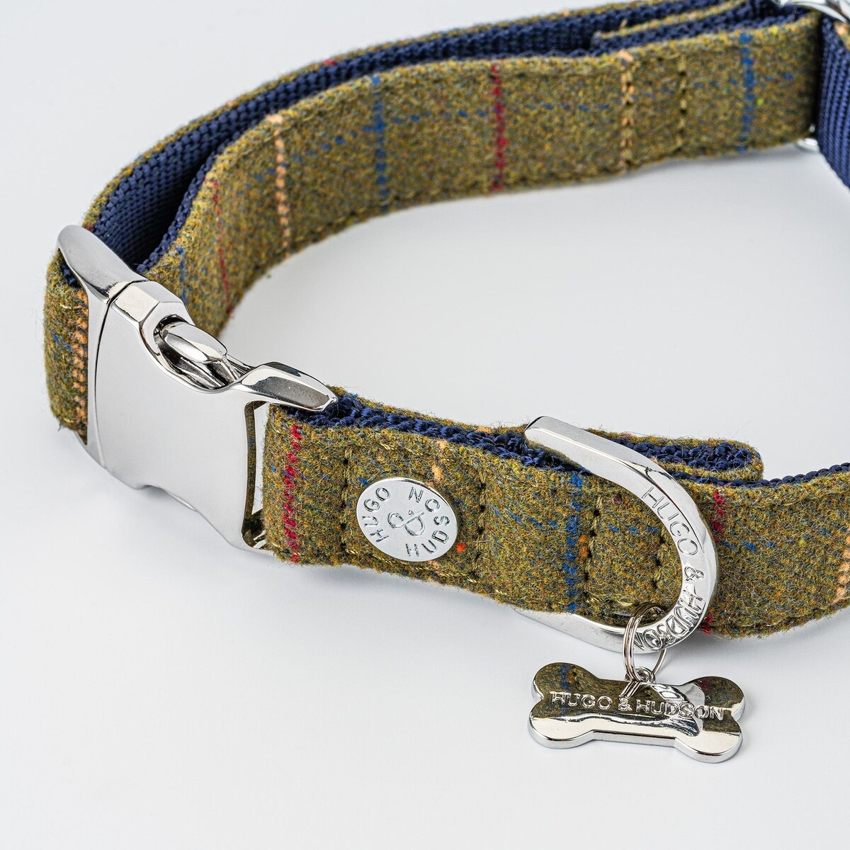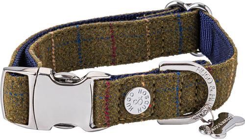 HUGO & HUDSON Checked Tweed Metal Buckle Dog Collar, Dark Green, Small