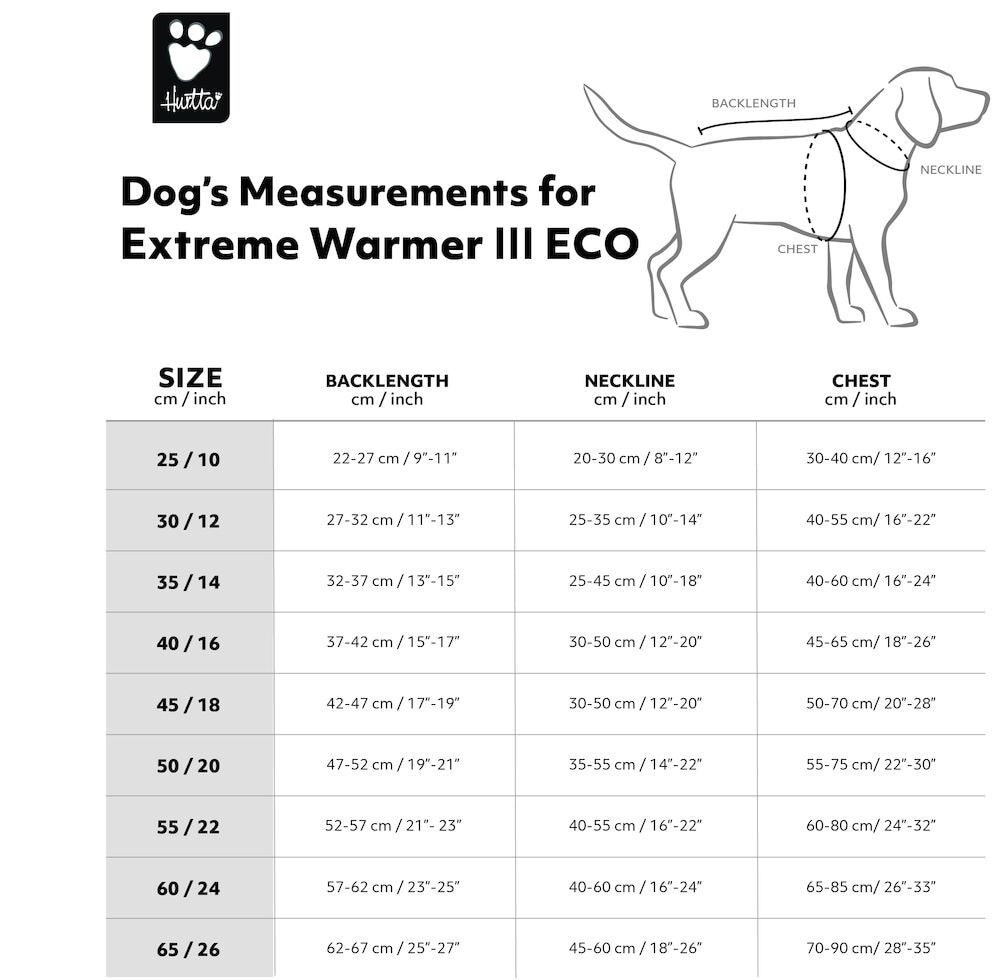 I have an older version of this coat, and it is outstanding. The sizing runs big and even though I measured properly and ordered the recommended size, the coat is big on the dog for which I was ordering it. I used it for a year and then decided to keep it for my larger dog, who is growing older and may soon feel cold more. I ordered this Extreme Warmer III ECO one size smaller. It arrived today and is perfect for my dog. It’s even got some great updates. I like that it snaps under her tail, although I’m not sure whether she’ll be able to pee without interference. That first glance, I’m not crazy about the new hook attachment for the belly band, but I’m sure I’ll get used to it. Hurtta coats are the best, hands-down. They keep my dogs warm, and they stay on and have great adjustment points. They’re worth the expense.